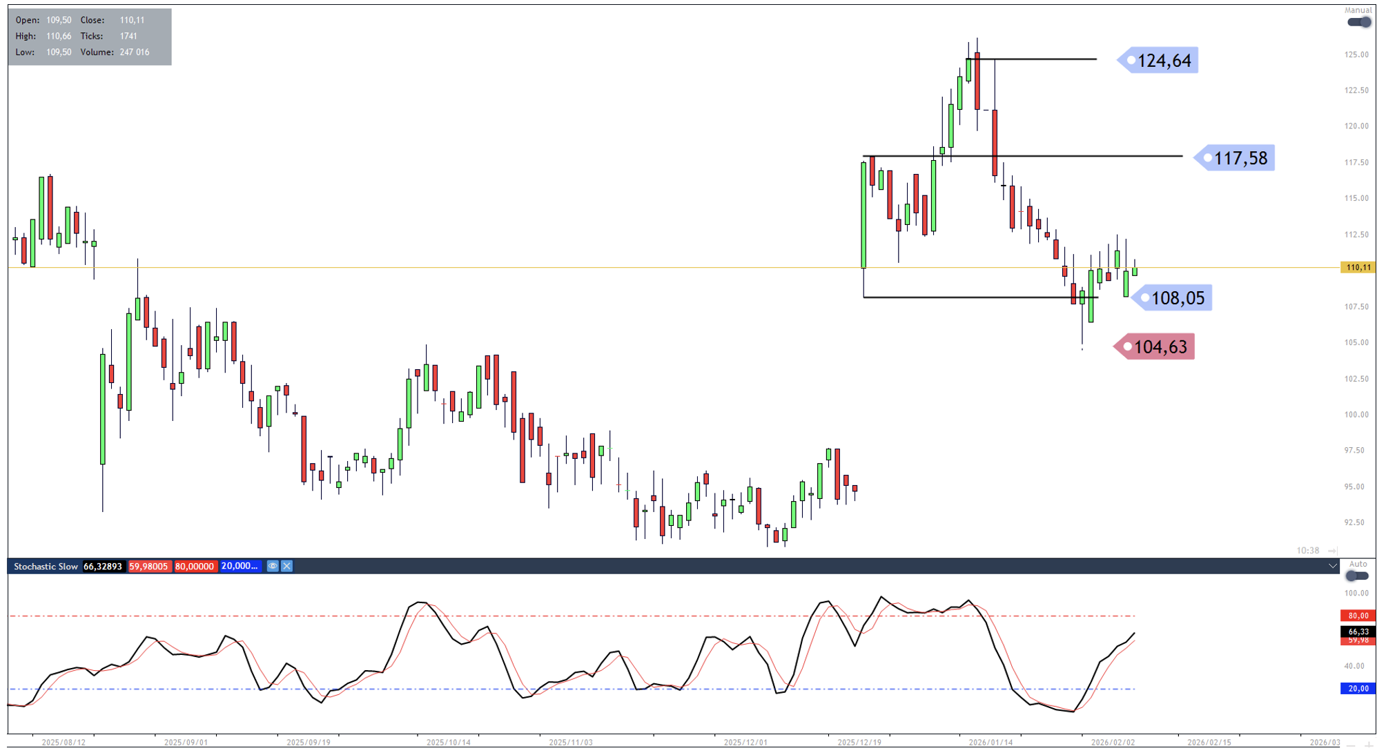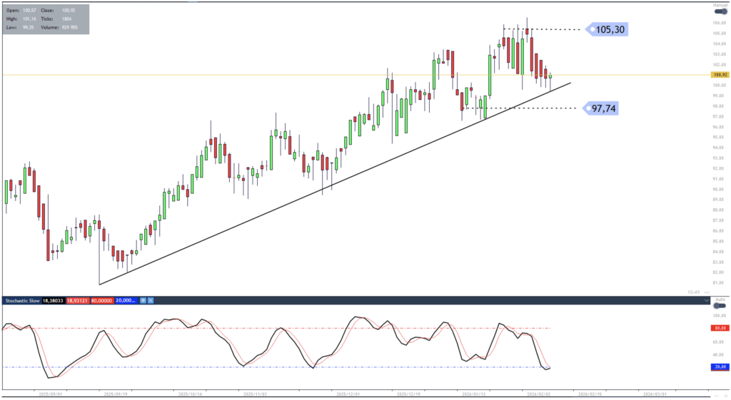 Should the reversal confirm with a positive close on today’s candle, a move back towards 105.30 is favoured. Traders who find long entry might consider using a close below the 97.74 level as a stop loss indication.