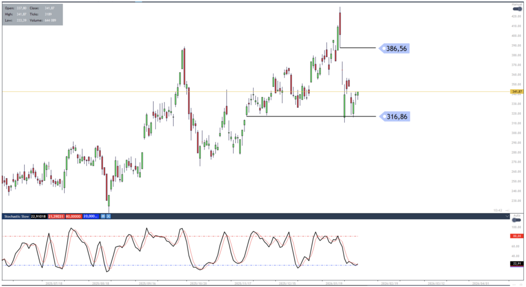 Harmony Gold has formed another bullish price reversal off support at 316.86. Gap resistance at 386.56 provides the initial upside resistance target, while a close below 316.86 would suggest the setup to have failed.