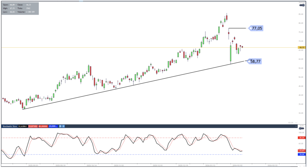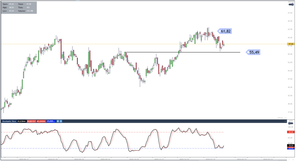 The share price of Telkom has produced its first pullback from recent highs. The pullback has found support and now started to reverse off the 55.49 level. A move towards 61.83 is favoured. Traders who are long might consider using a close below the 55.49 level as a stop loss indication.
