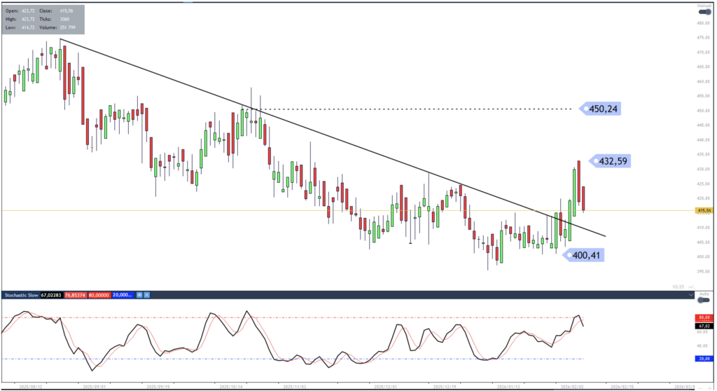 Should we get a bullish price reversal before trend line support (previous resistance) is reached, traders might target a move back towards the 432.59 and 450.24 levels, using a close below the 400.41 level as a stop loss indication.