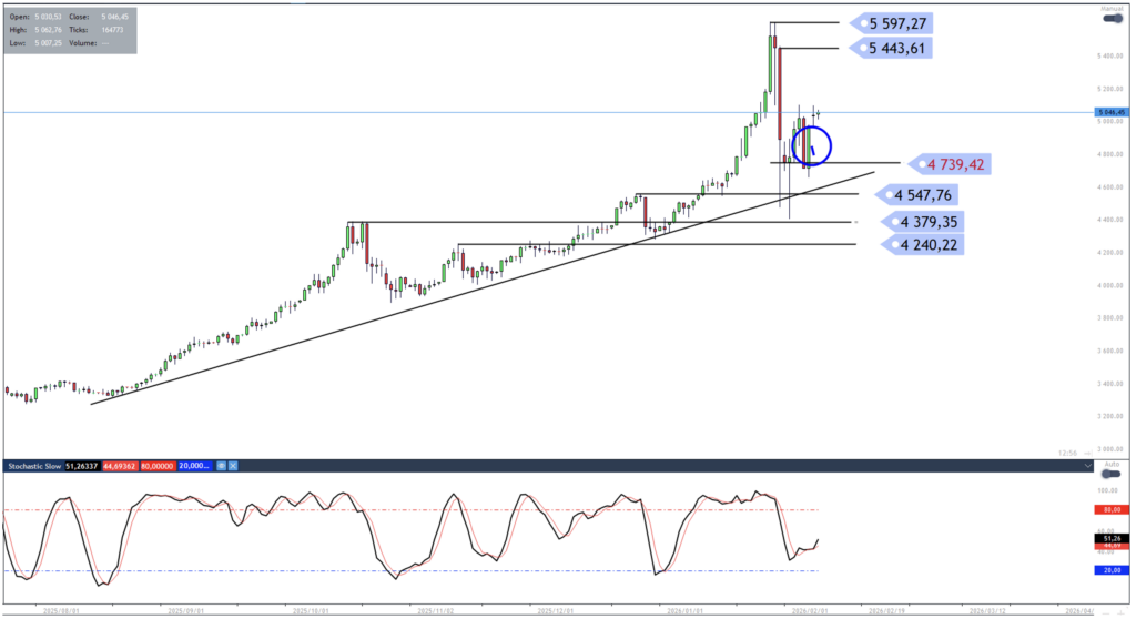 A move towards 5443 is favoured, while a close below the 4740 level might be used as a stop loss consideration.