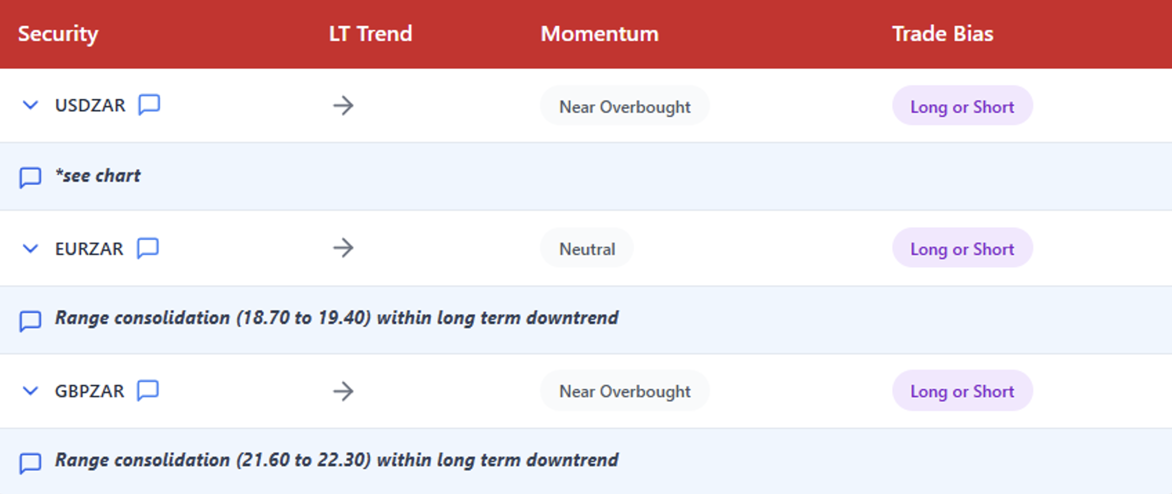 The upside breakout scenario for the USD/ZAR manifested since our last note, with the price closing above the 16.42 level. The move higher fell just short of the 17.00 resistance target.
