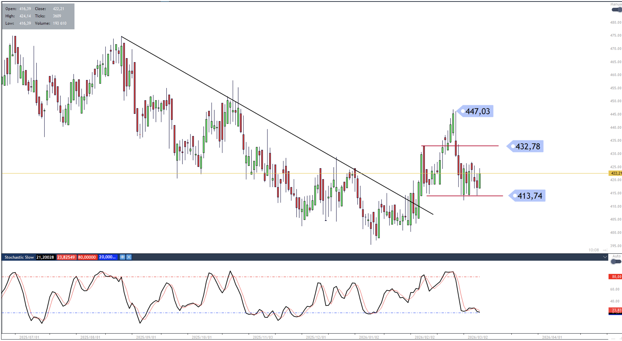 To confirm the reversal, we would like to see a positive close today. In this scenario, we target a move back towards the 435.60 resistance level.
