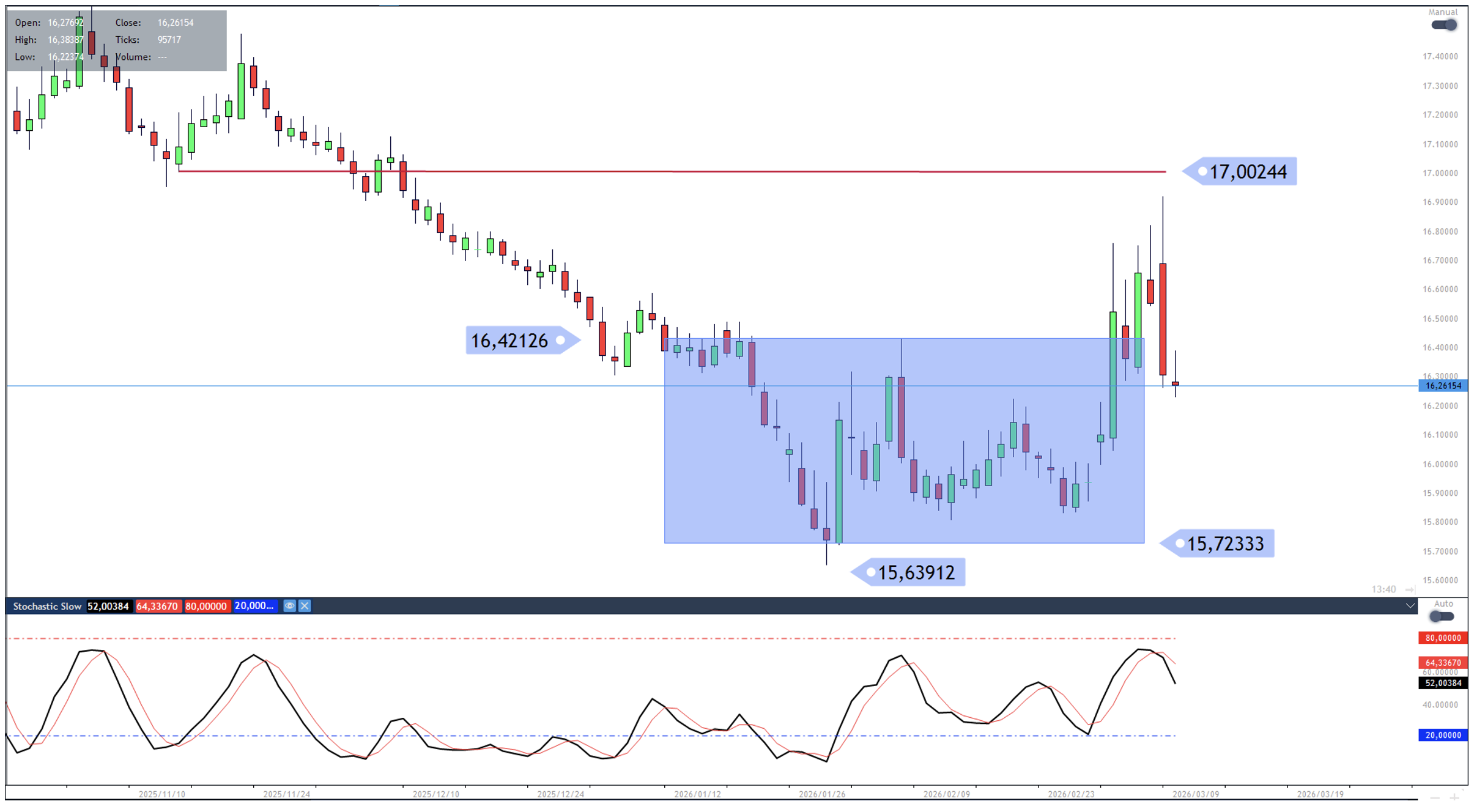 The upside breakout negates the longer-term downtrend but does not yet assume a renewed uptrend. For now, we consider a large range-bound environment for the currency pair between levels 15.72 (support) and 17.00 (resistance).