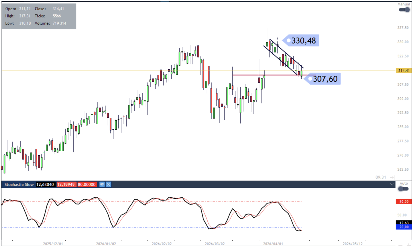 Ideally, we would like to see a break (close) above the resistance of the flag / channel on the chart above. In this scenario a retest of the 330.48 level is favoured, while a close below the low at 307.60 might then be used as a stop loss consideration.