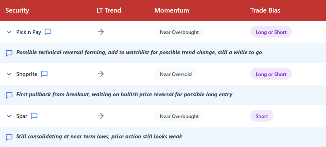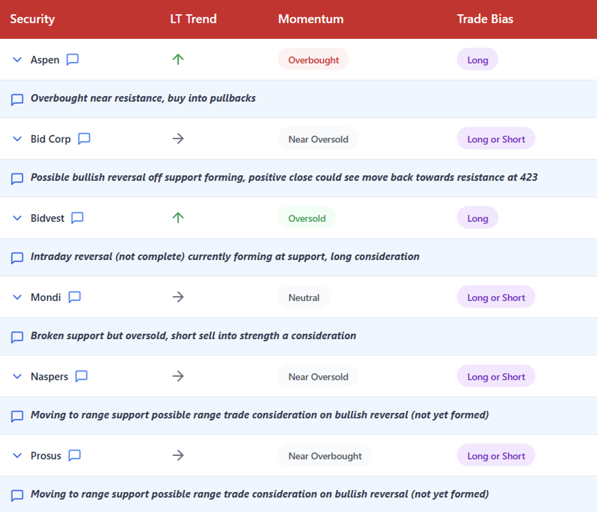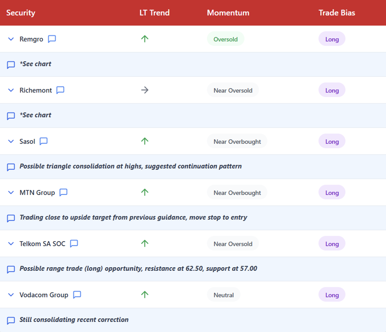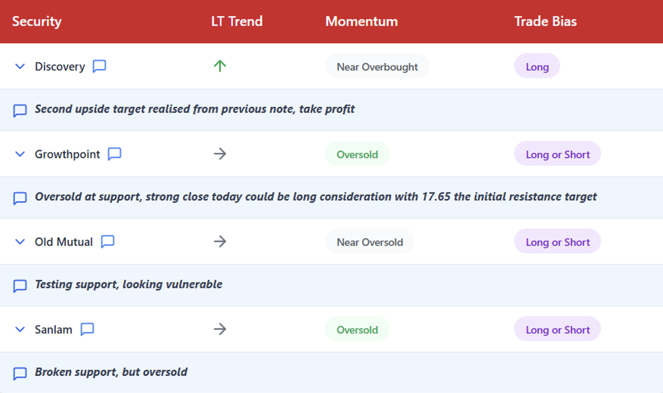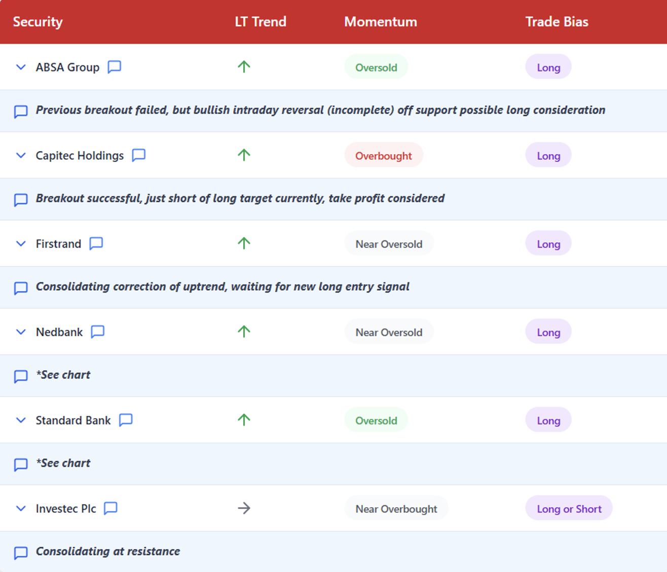 On the JSE, Nedbank and Standard Bank are showing early signs of reversing higher from oversold support, and Richemont offers a potential re-entry after completing its first pullback since breaking out.