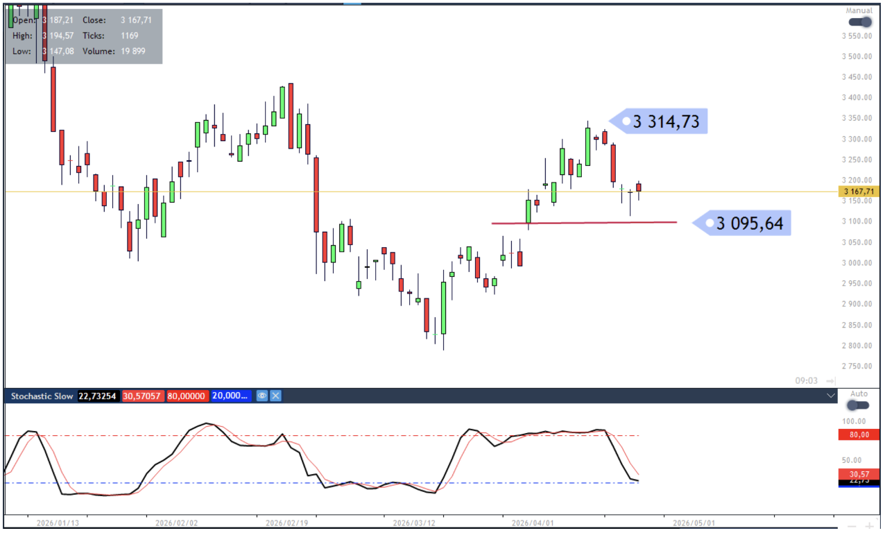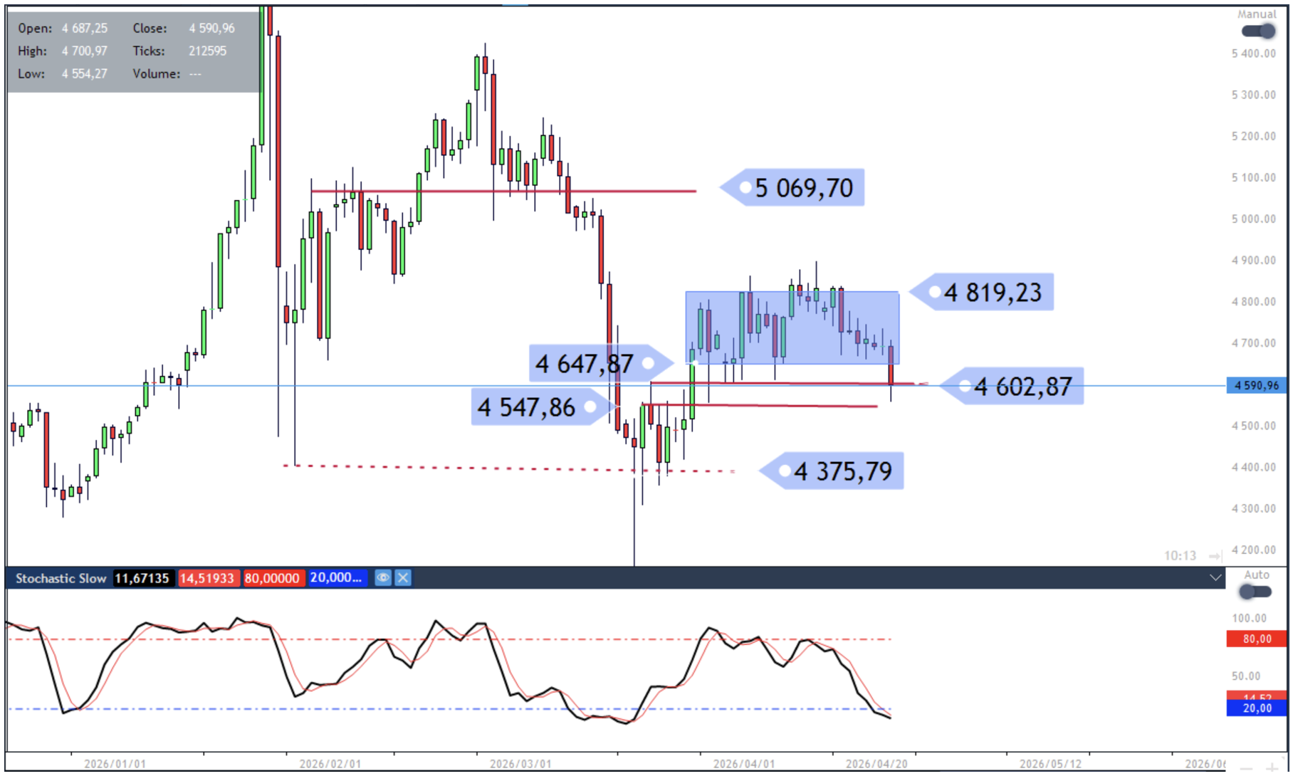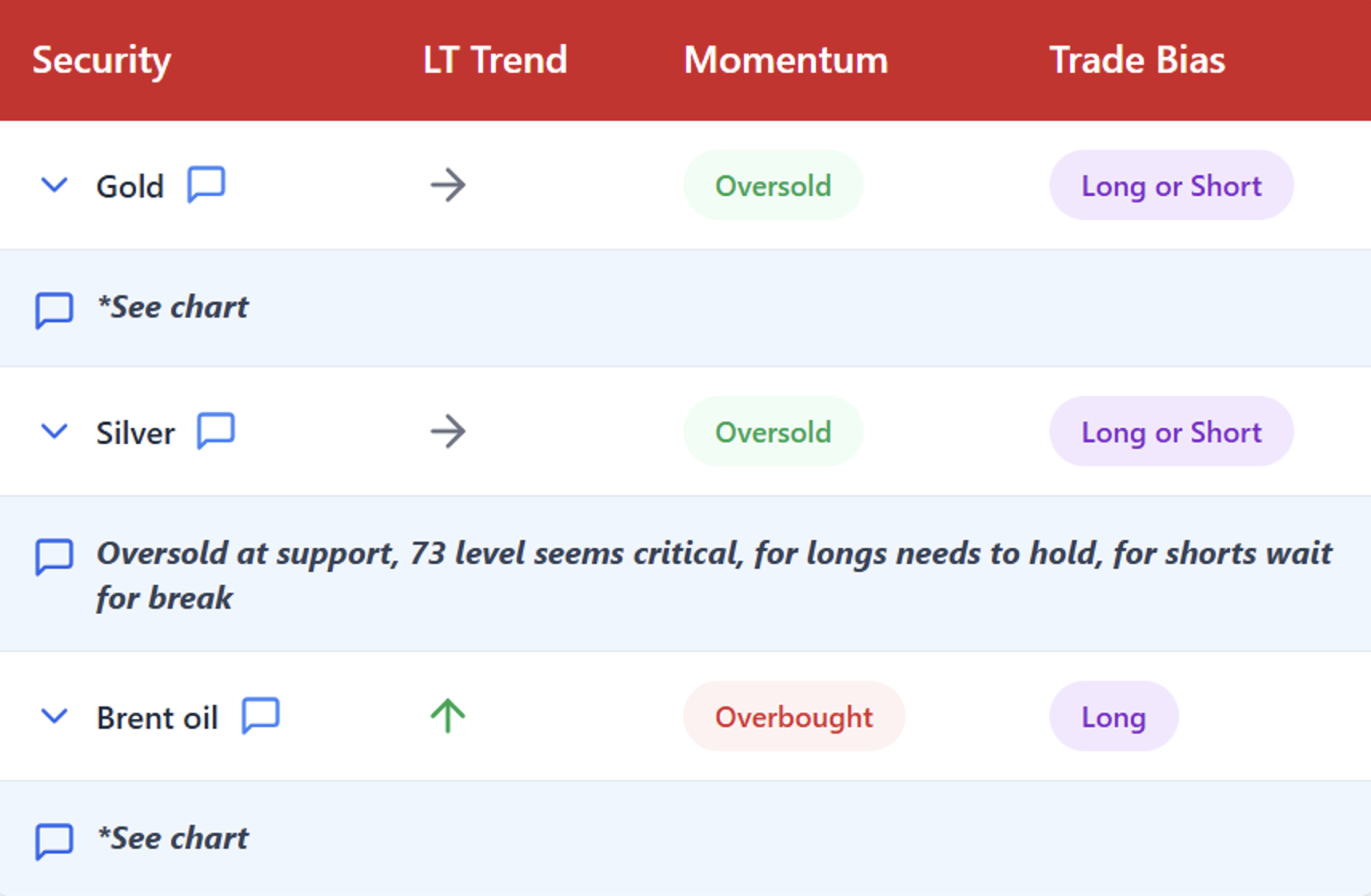 The J40 has broken near-term support and risks confirming a significant structural low, while the rand recovers off guided support levels but lacks a firm trend bias ahead of resistance at 16.75. Gold is under pressure at the bottom of its range in oversold territory, whereas Brent crude holds its long bias following a bullish reversal from a false break lower.