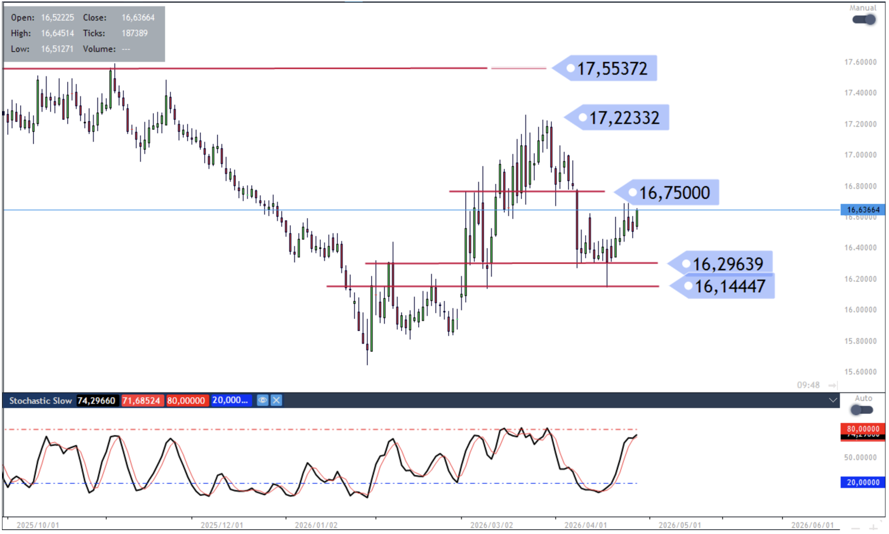 Traders will want to see how the price handles the 16.75 level where we again wait for a reversal or breakout. A breakout would suggest 17.00 (not labelled) as the initial target, while a reversal would suggest a move back towards 16.29 instead.