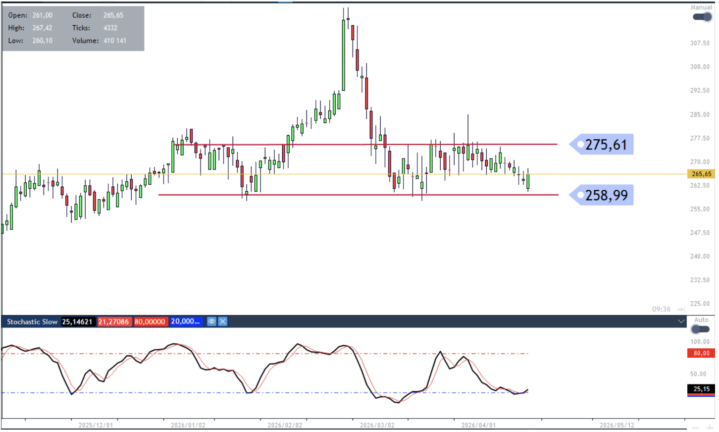 In this scenario, a move towards 275.61 is favoured, while a close below support at 258.99 would consider the reversal to have failed.