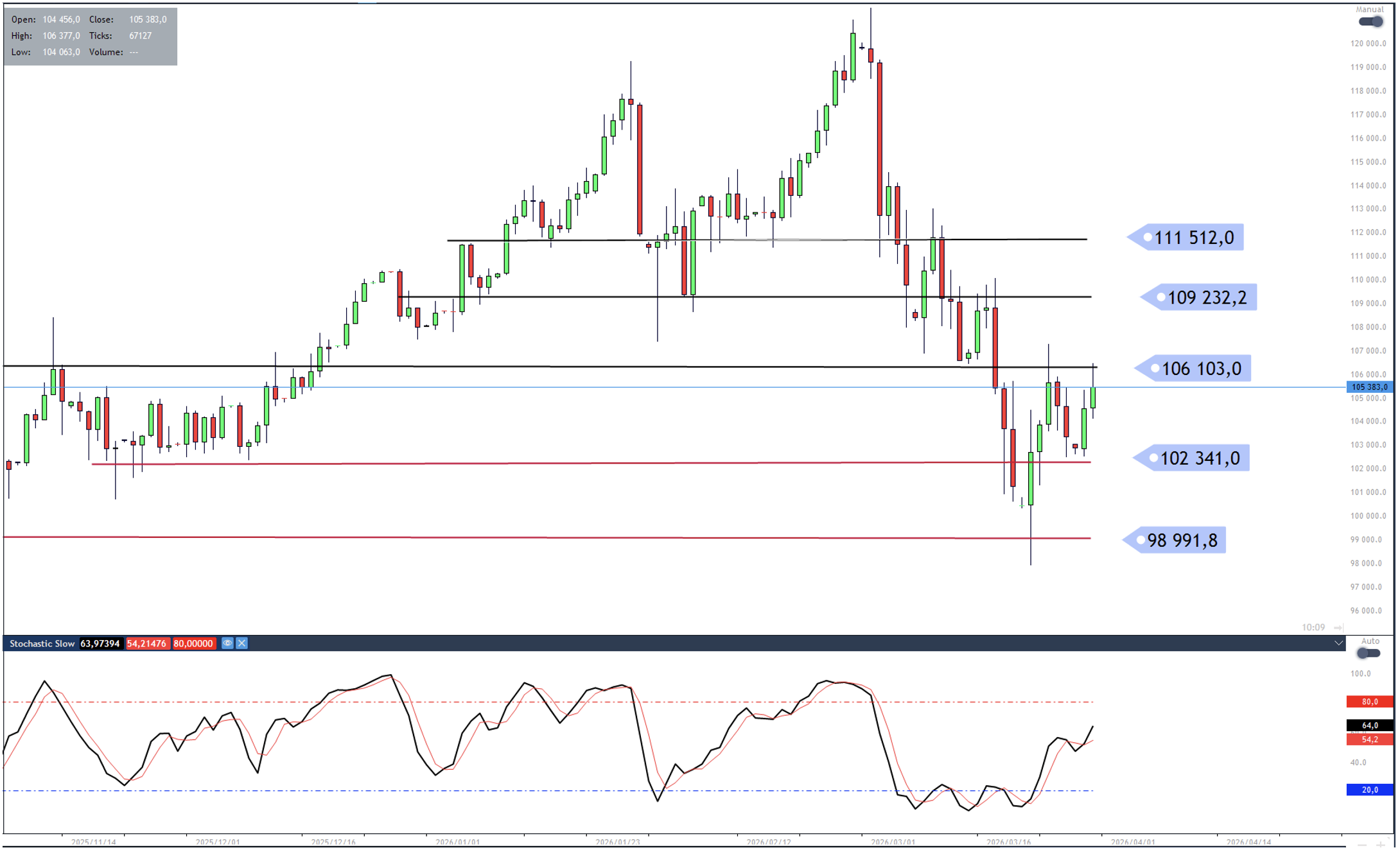 The J40 is currently finding resistance at the 106,103 level, with support at 102,341 making up the bottom end of a short-term range.