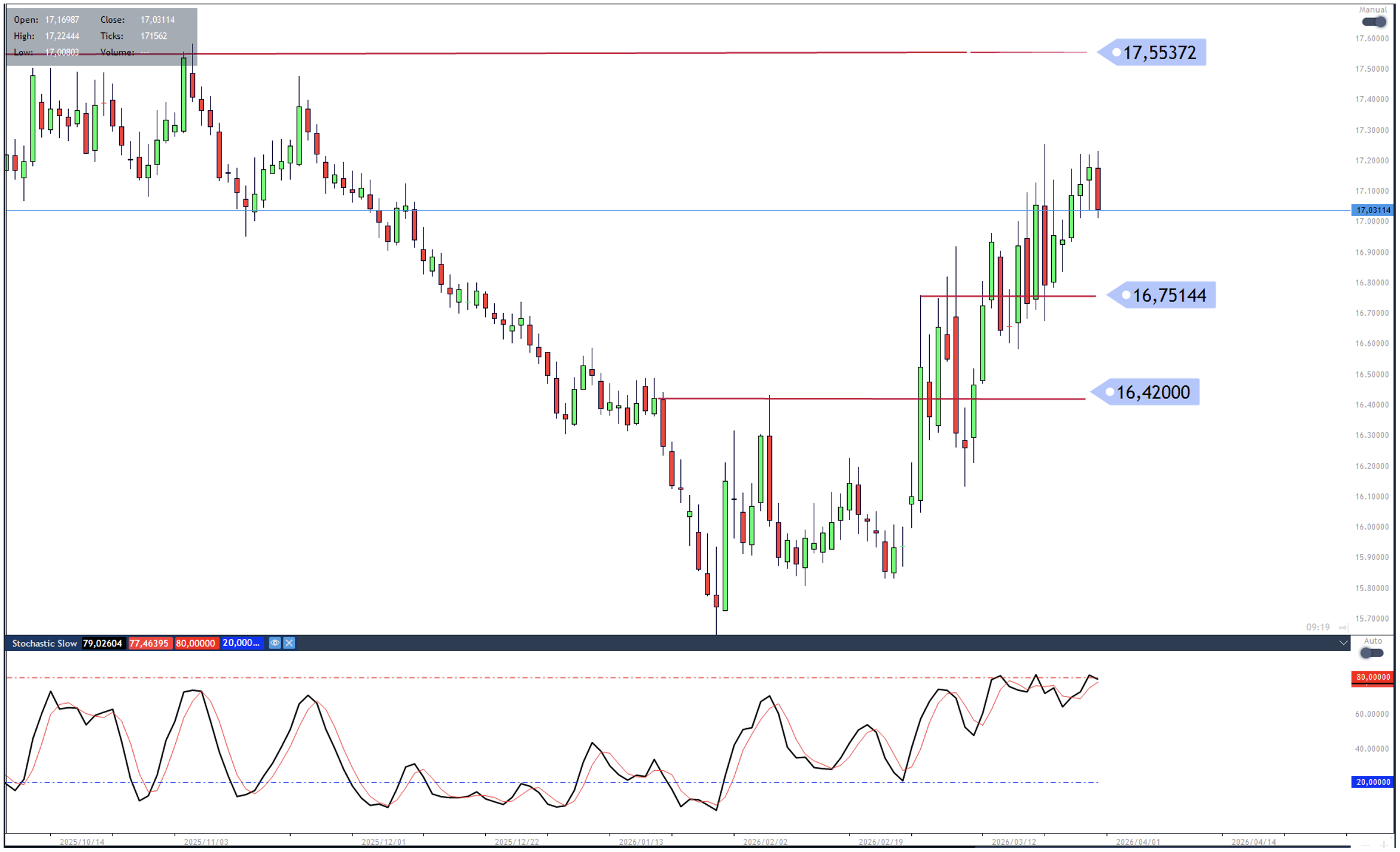 Should today’s weakness erode and we instead see a positive close on today’s candle, this could imply that the move higher is continuing, with 17.55 as the next upside resistance target.