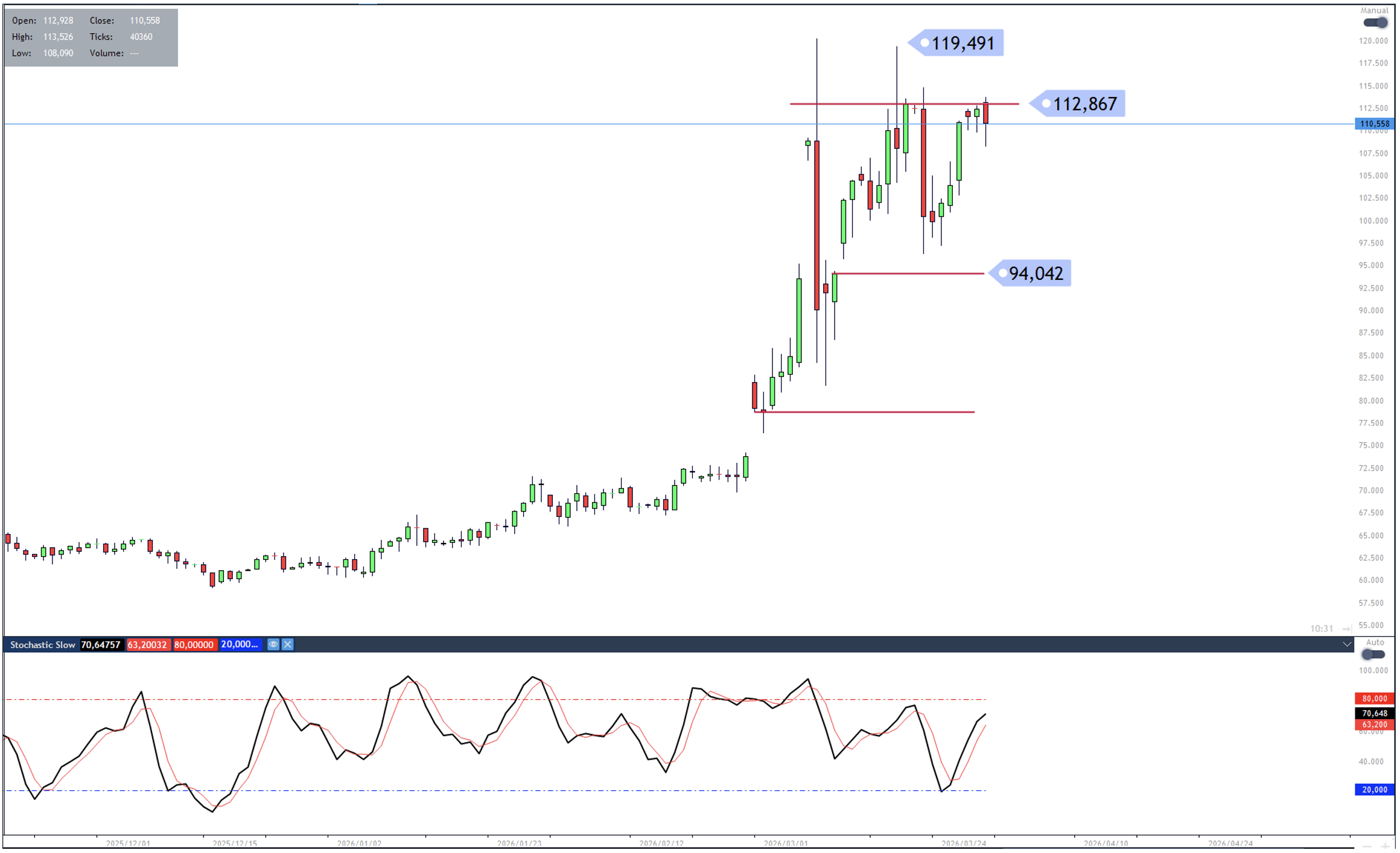 This hasn’t happened yet and war time volatility would suggest waiting for confirmation (i.e. a breakout). Failure to break the 106,103 level could instead suggest a retest of support at 102,341.