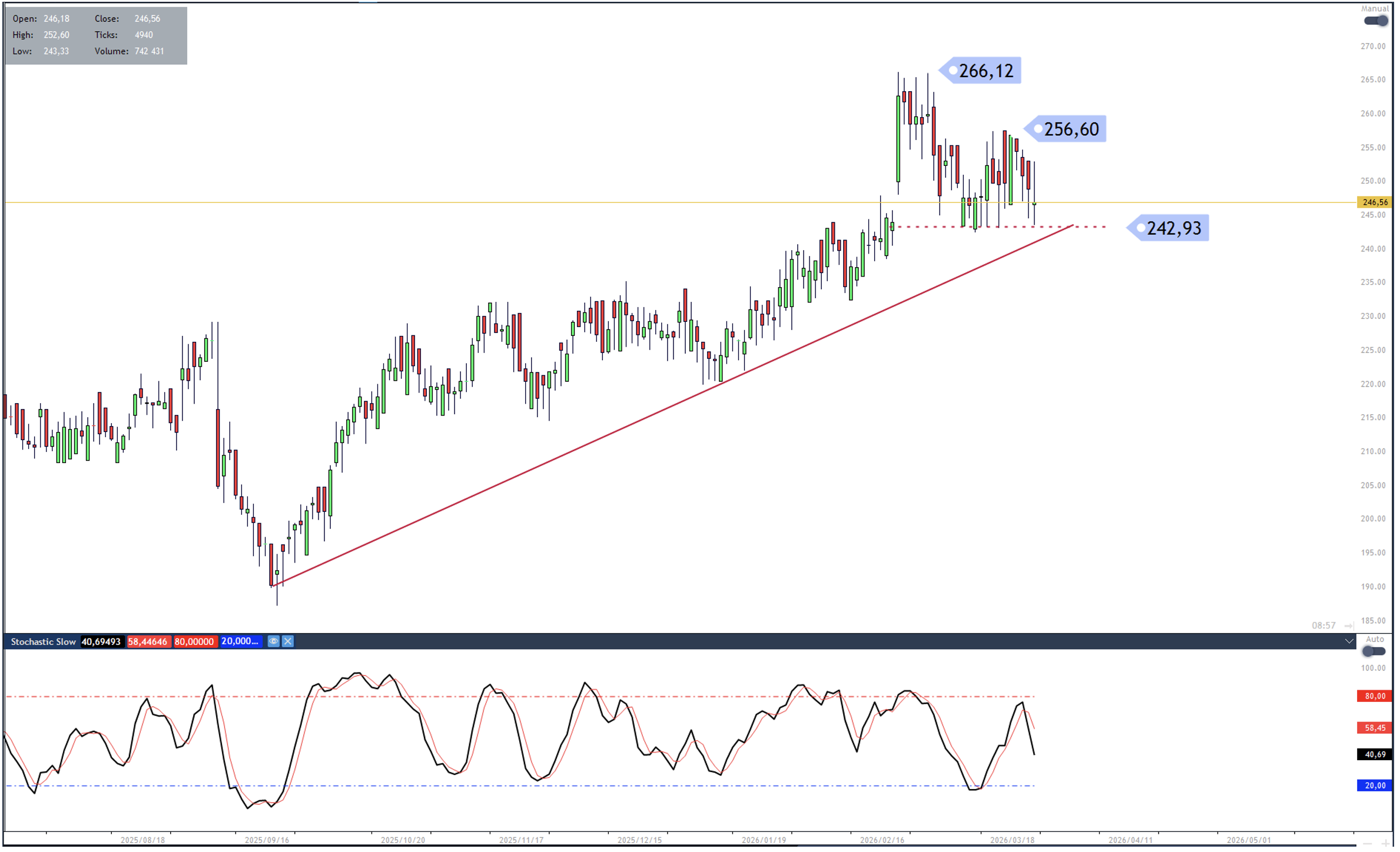 The share price of Discovery has found a confluence of trend line and horizontal support at the 242 level. We are looking for a bullish price reversal off this level to suggest the longer-term uptrend is resuming. In this scenario, a move towards the highs at 256.60 and 266.12, respectively, would be targeted, while a close below trend line support might be used as a stop loss indication.