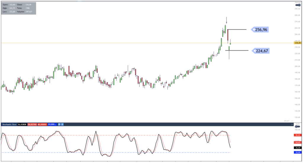 Yesterday’s intraday price reversal and today’s gap higher suggests that the short term correction of the longer term uptrend is over. Gap resistance at 256.96 provides the initial upside resistance target, while a close below 224.67 would suggest the setup to have failed.
