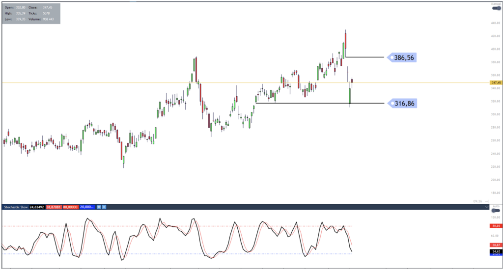 Yesterday’s intraday price reversal and today’s move higher suggests that the short-term correction of the longer-term uptrend may be over. Gap resistance at 386.56 provides the initial upside resistance target, while a close below 316.86 would suggest the setup to have failed.