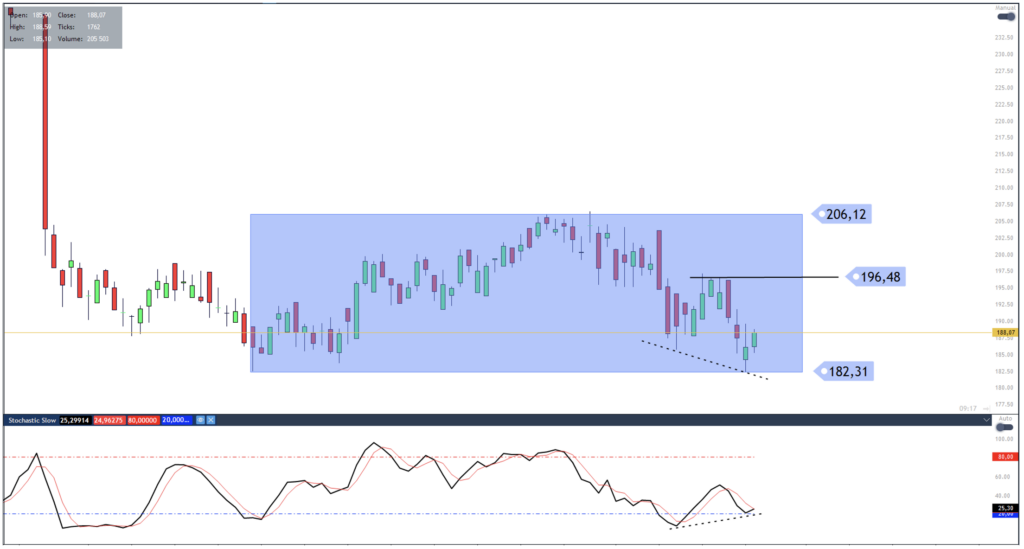 The share price of Mr Price remains in a long-term downtrend. In the short term however, we see a consolidation has started to form which resembles an inverse head and shoulders formation. This pattern is not yet complete, and we would need to see a close above the horizontal resistance line on the chart above for the pattern’s validity.