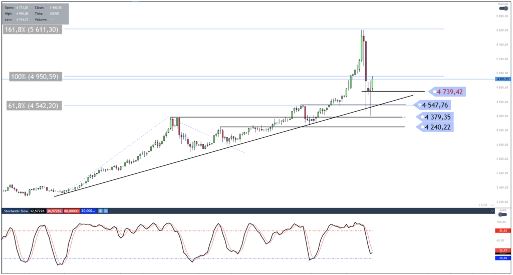 Gold rallied just short of the ‘long term’ target at 5611, before undergoing a sharp correction. The correction reached a confluence of both trendline and horizontal support before undergoing a sharp rebound.